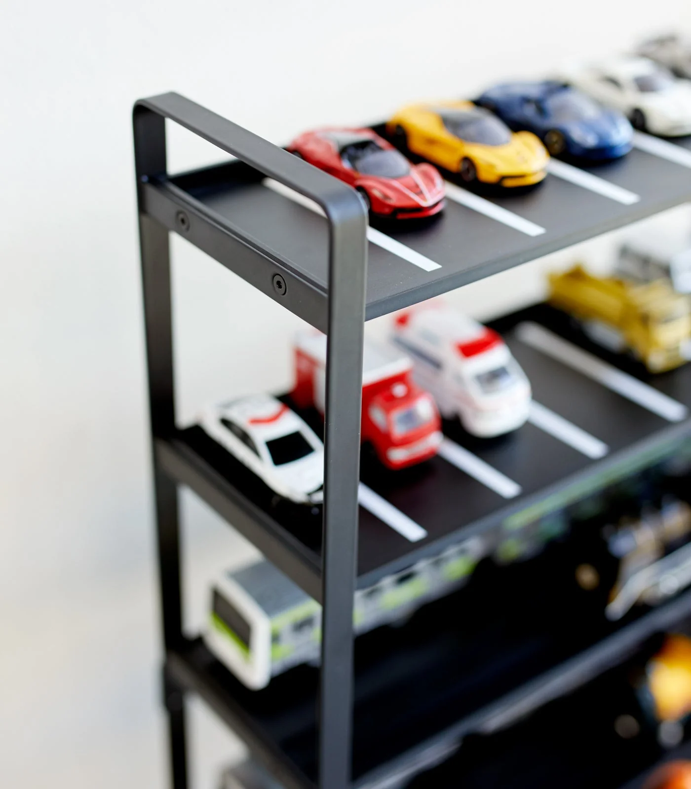 The new hot spot for toy cars and trains. Six decks of parking and storage for toy cars, trucks, and trains. This toy garage doubles as a play area and a storage organizer. First, kids can wheel, drive, park, flip, and race their mini-mobiles. When itās time to tidy each toy car has its own special parking spot, making clean-up easier and more enjoyable. For toy train enthusiasts, flip the tiers and use the side with the tracks. You can flip all the tiers, or just a few, depending on what your collection looks like!